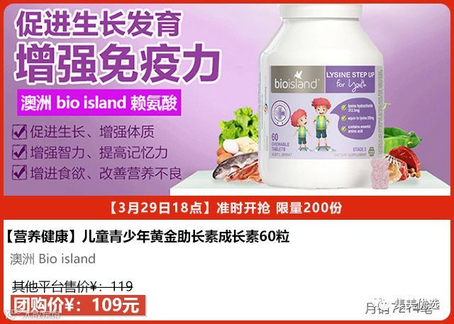【Bio island助长素黄金成长素】营养强化剂,补充足够的赖氨酸能提高蛋白质的吸收和利用,达到均衡营养,促进生长发育。好处多多:1.提高智力,促进生长,身高增加,体重增加 2.增加食欲增强体质,改善营养不良状况 3.帮助产生抗体,提高免疫力,提高减少感染疾病几率~