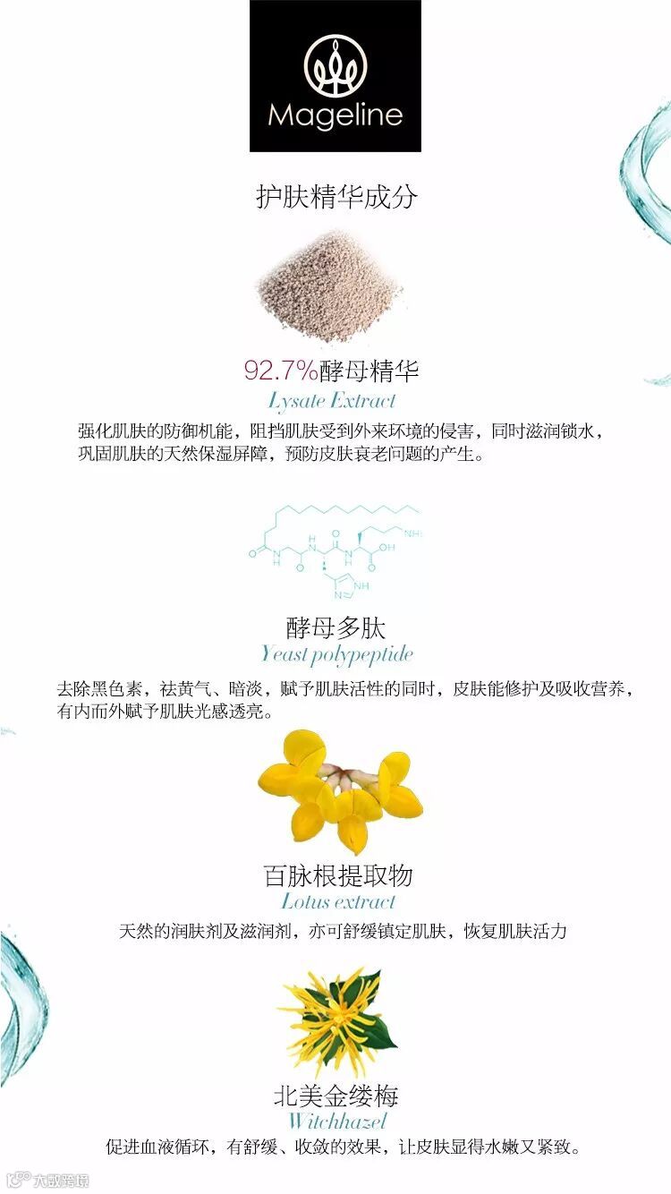 酵母提取物蕴含丰富的多聚谷氨酸等抗氧化成分,有很好的清除自由基抗衰老功效,可改善肌肤纹理,细纹和皱纹,增加皮肤弹性,使肌肤变得平顺、细致。除此之外,麦吉丽平衡水中含有的雪莲提取物,酵母多肽等可促进排出浊质,活化肌肤,也可减轻和预防皮肤在早期衰老过程中产生的肤色暗淡问题。