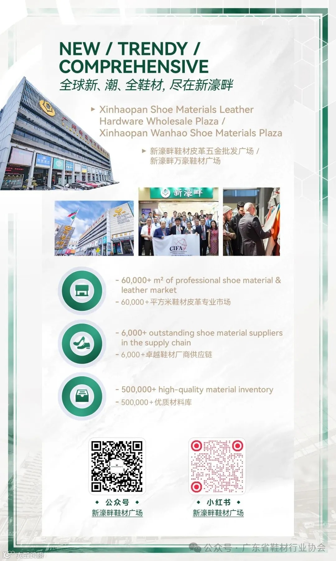 集聚超过三十年鞋业专业市场运营经验,新濠畔正集中力量,践行【全球制鞋产业服务一体化中心】构想,整合行业内外资源,加强跨界合作,利用互联网电商优势,全面实现制鞋产业链上下游无缝对接,最大限度降低采购和销售成本,为行业提供最优质、时尚的制鞋材料。
