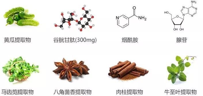 含有高浓缩谷胱甘肽300mg及8种维生素成分,另外还添加了黄瓜提取物、烟酰胺、腺苷、马齿苋、八角茴香、肉桂、牛至叶等提取物。