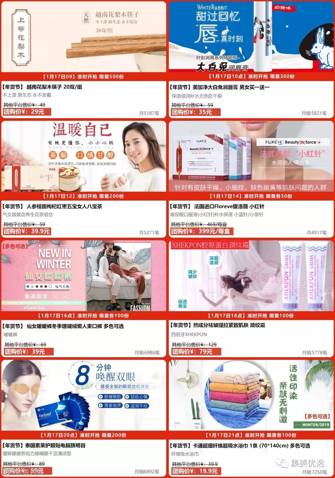 集美商城1月8日起年货节开幕,8档准时开抢!鲜果美酒,坚果化妆品,海鲜日用品臻品油。置办年货来集美,千款好货秒杀价包邮到家!