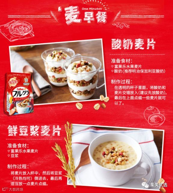 好吃的营养麦片,Calbee麦片一碗约50g等于吃了4根香蕉的食物纤维,每天一碗再也不便秘。富含铁分和8种维生素。吃50g等于补充了每天人体所需铁粉和维生素的1/3。作为孕妇儿童的营养早餐和宵夜,方便又营养。可以直接当零食吃,可以泡牛奶、泡酸奶、豆奶、豆浆、吃法多种多样。