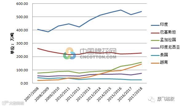 根据USDA的预测显示,2017/18年度全球主要棉花消费国,其中包括印度、巴基斯坦、孟加拉国、印尼、越南等国的棉花消费将同比上涨,特别是印度和越南的消费增长将明显增加。