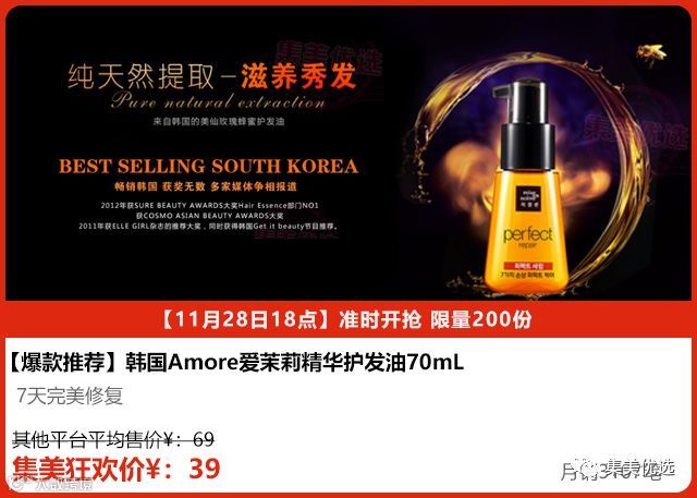 韩国超级火的爱茉莉护发精油70ml,主要针对因烫染而造成的发质损伤。一般使用的护发产品都需要清洗,在发部停留不了多少时间,所以对受损发质的修护效果也微乎其微。而爱茉莉护发精油在洗后的头发上涂抹,一点也不油腻。你能够感觉到涂上后头发有垂重感尤其烫发的不会感到头发毛躁轻飘。保湿滋润,改善分叉,营养修复,恢复弹力,改善干燥,改善毛躁,赋予活力,使用后7天亲们就能看到明显的效果!头发7成干的时候涂抹效果更好