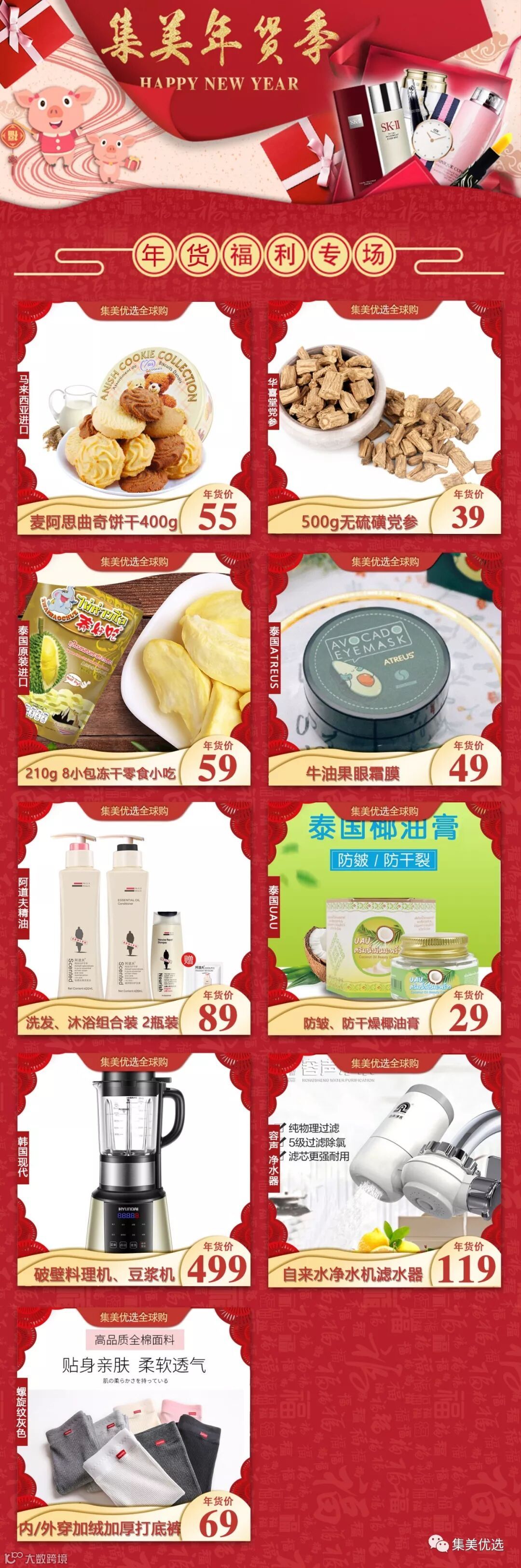 集美商城1月8日起年货节,8档准时开抢!鲜果特产,坚果化妆品,珠宝日用品新衣服。置办年货来集美,千款好货秒杀价包邮到家!