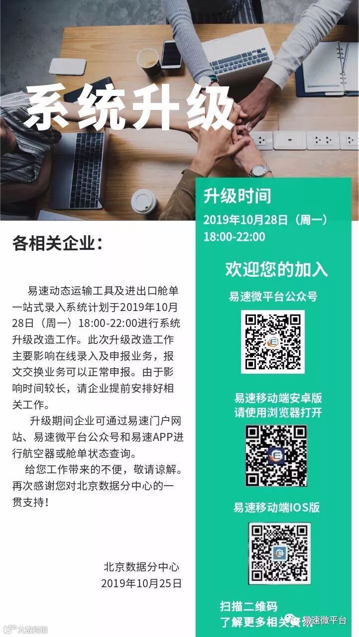 易速动态运输工具、进出口舱单一站式录入系统升级改造通知