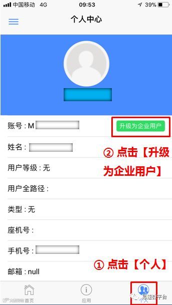 4、“个人用户”登录成功后,点击下方【个人】,点击【升级为企业用户】。如下图所示: