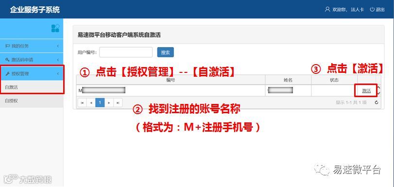 ③ 点击左侧的【授权管理】-- 【自激活】。在“编号”栏下,找到格式为“M+注册手机号”的注册账号,点击【激活】,即可成功完成自激活操作。