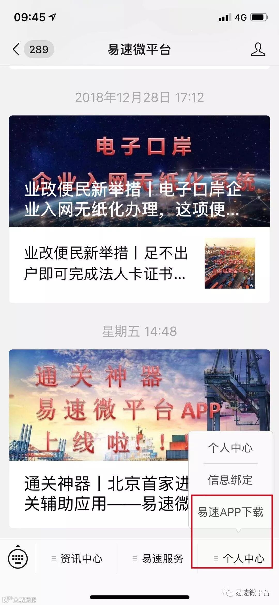方式二:通过“易速微平台”微信公众号中的个人中心下载。