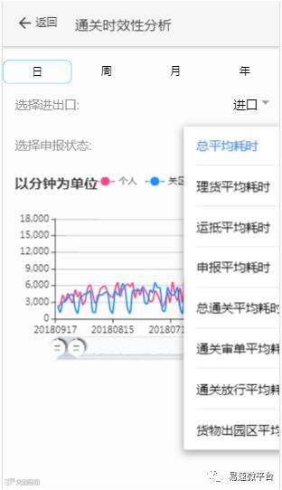 “总平均耗时”、“运抵平均耗时”、“申报平均耗时”等多种类型可选,让企业依照自身需求选择想获取的数据对比信息,有效地横向对比各类数据,直观地查看本企业通关效率,及时了解自身的通关能力。