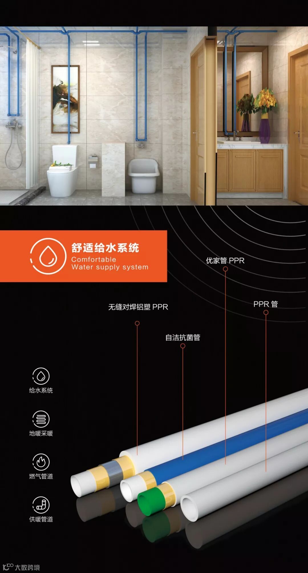 赫能舒适给水系统包含了市场上大部分PPR管道类型,满足不同的情况和需求。安装过程简单速度,让你轻松搬进新家。