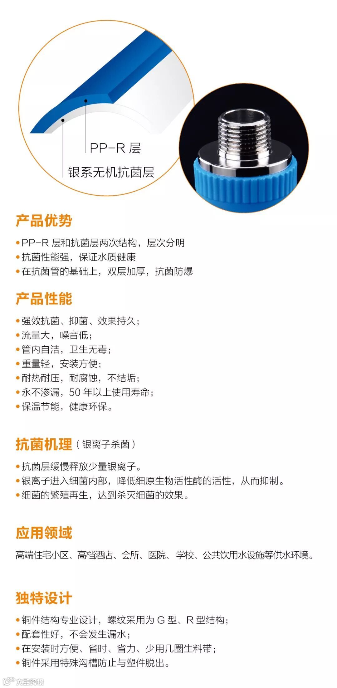 德国赫能自洁瓷芯抗菌PP-R管是在普通的PP-R管的基础上复合一层无机抗菌保护层,它缓慢释放活性银离子,有效消除水肿病病菌危害,时刻保护您的健康,创造优质水生活。该产品内壁过水层采用高分子聚合工艺技术,管壁更光滑、不附着杂质、不结垢、不滋生细菌与藻斑,有良好的抗菌与自净功能。