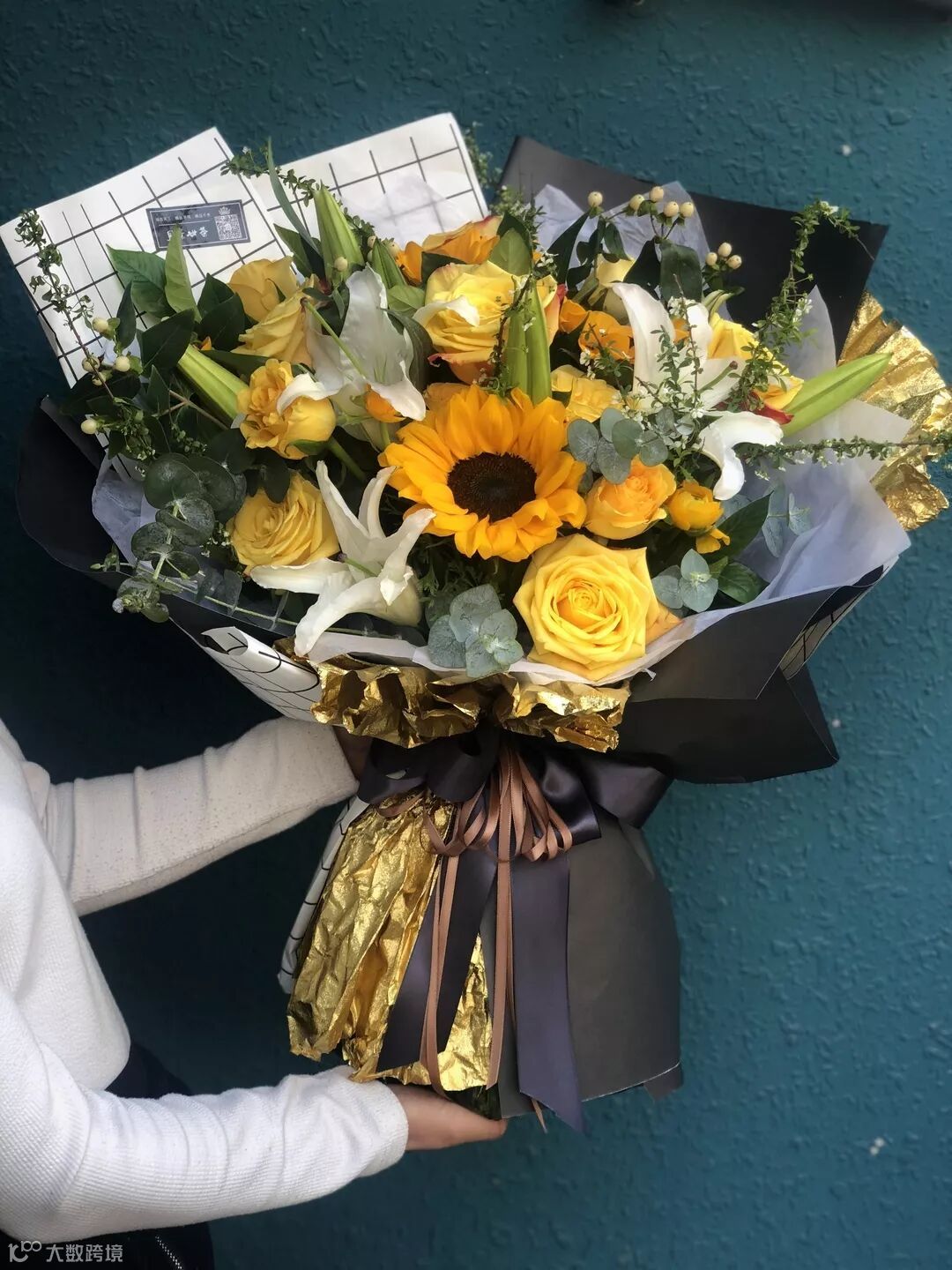 采用花材:向日葵、百合金辉玫瑰、尤加利叶、洋牡丹、雪柳、火龙果