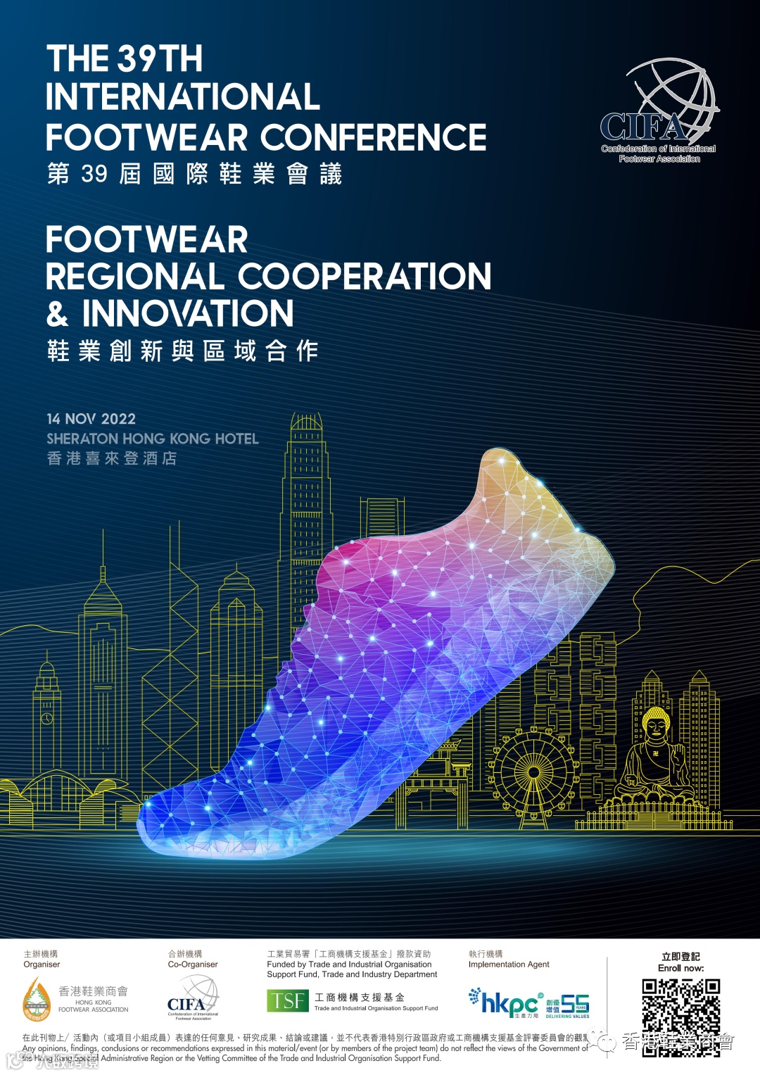 第三十九届 CIFA 国际鞋业会议定于2022年11月14日在香港尖沙咀喜来登酒店隆重举行,邀请出席的国际鞋业成员均为 Confederation of International Footwear Association (CIFA) 的成员,成员所在地包括中国、越南、泰国、菲律宾、马来西亚、缅甸、南韩、印尼、印度、柬埔寨、孟加拉、中国台湾、中国香港等地,每家成员皆为当地的主要鞋业机构。CIFA 成员的鞋履生产数量超过全球供应量八成,是国际鞋业一个极具影响力的组织。由于各地鞋业首脑云集一堂,就交流各地鞋业状況, 开拓市场寻找商机,提升本地优质鞋履产品形象而言,实属难得机遇。