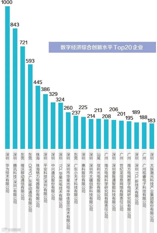 数字经济综合创新水平前20强企业中,华为技术有限公司位列第一(创新水平1000),腾讯科技(深圳)有限公司位列第二(创新水平843),两家企业均位于深圳;维沃移动通信有限公司位列第三(创新水平721),OPPO广东移动通信有限公司位列第四(创新水平593),第3、4名企业均位于东莞;位于珠海的珠海格力电器股份有限公司位列第五(创新水平445)。