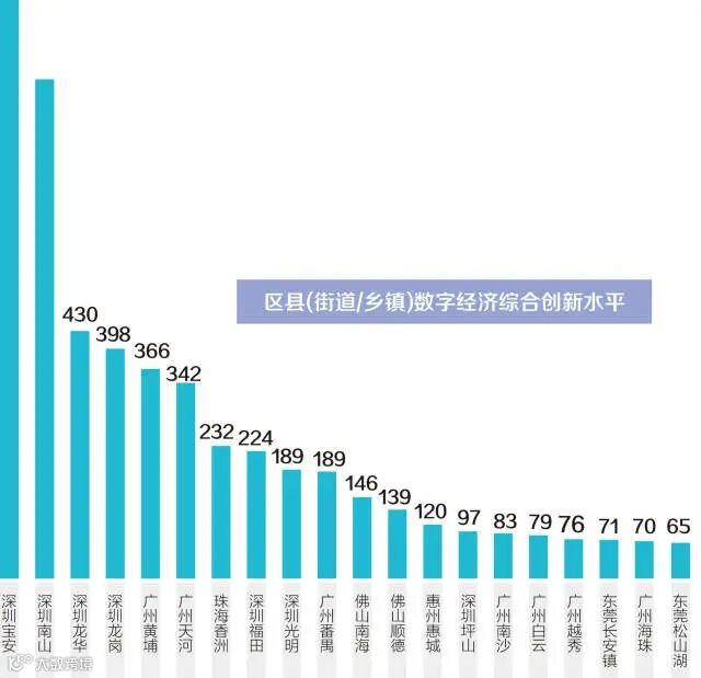 从县域(街道/乡镇)数字经济综合创新水平看,前20位均处于珠三角,深圳有7个市辖区进入前20名,宝安、南山、龙华和龙岗位分列前4;广州有7个市辖区进入前20名,黄埔和天河位列第5位和第6位;佛山市和东莞市各两个区(乡镇)入列,南海区排名略高于顺德区,东莞则有长安镇、松山湖入榜;珠海市和惠州市也各一个区上榜,分别为香洲区和惠城区。