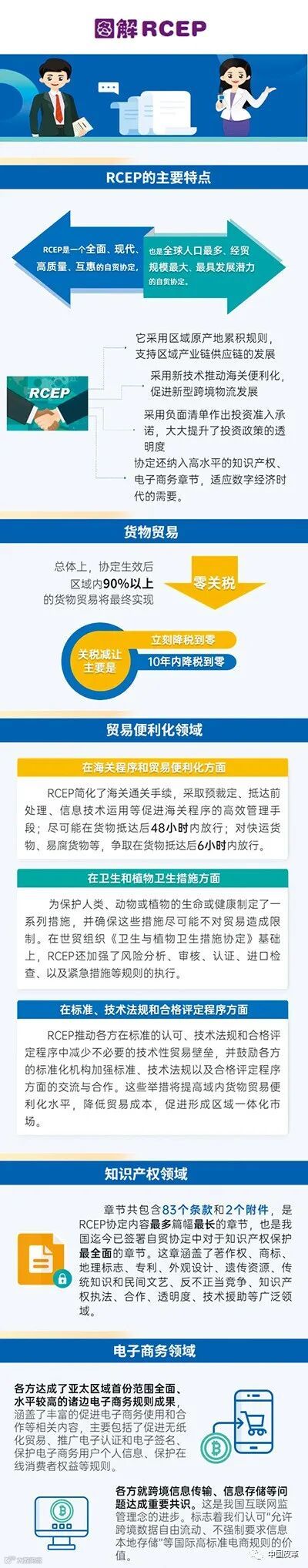 该负责人表示,RCEP成员之间经济结构高度互补,域内资本要素、技术要素、劳动力要素齐全。RCEP使成员国间货物、服务、投资等领域市场准入进一步放宽,原产地规则、海关程序、检验检疫、技术标准等实现统一,建立了高水平的知识产权、电子商务、政府采购、竞争和贸易救济等规则,这将为各国企业打造稳定、自由、便利和互联互通的优质营商环境。