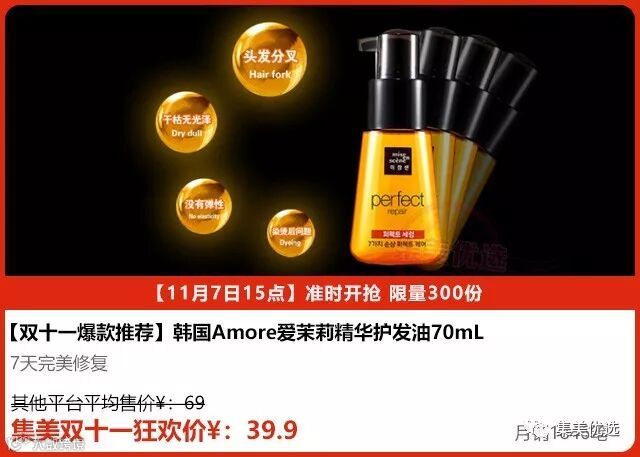 爱茉莉护发精油70ml、修复受损头发、主要针对因烫染而造成的发质损伤。在洗后的头发上涂抹的一点也不油腻。涂上后头发有垂重感,烫发后不会感到头发毛躁轻飘。保湿滋润,改善分叉,营养修复,恢复弹力,改善干燥,改善毛躁,赋予活力,使用后7天就能看到明显的效果!