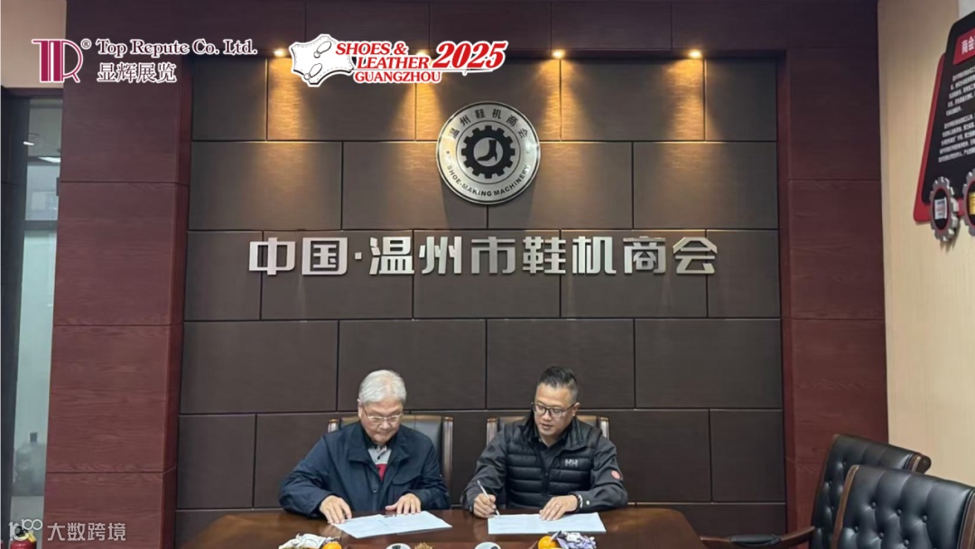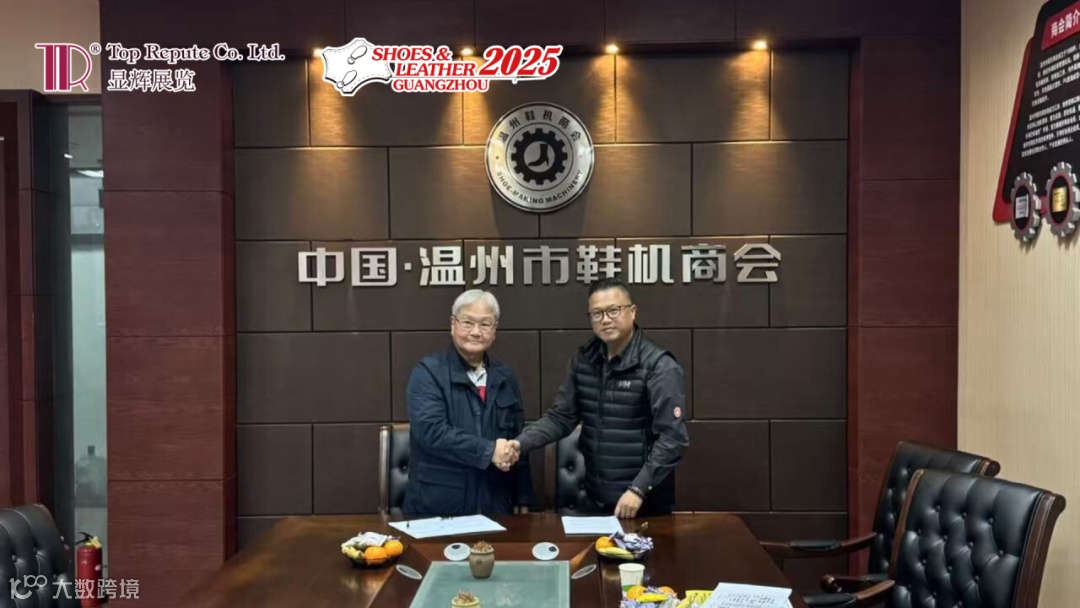 2024年12月5日,我会名誉会长/显辉展览谢昭忠董事长带领显辉团队与温州市鞋机商会李奔会长等商会成员协商治谈,最终就「显辉广州国际鞋类、皮革及工业设备展览会」达成 5年 战略合作,并进行了签约仪式。