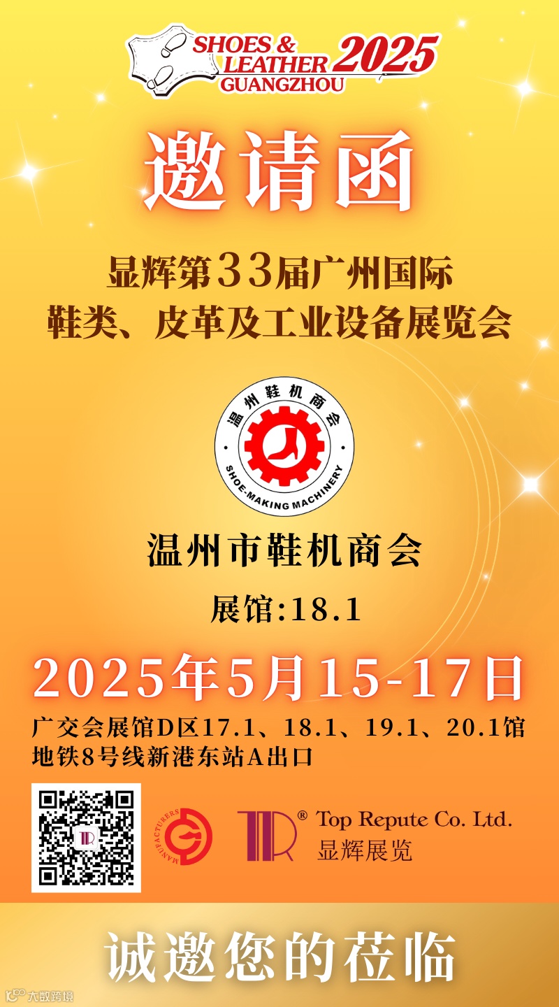 温州鞋机商会将以组团形式强势回归2025年显辉广州第33届鞋革工业设备展,展团设在18.1机械馆,预计规模 200+ 个展位。