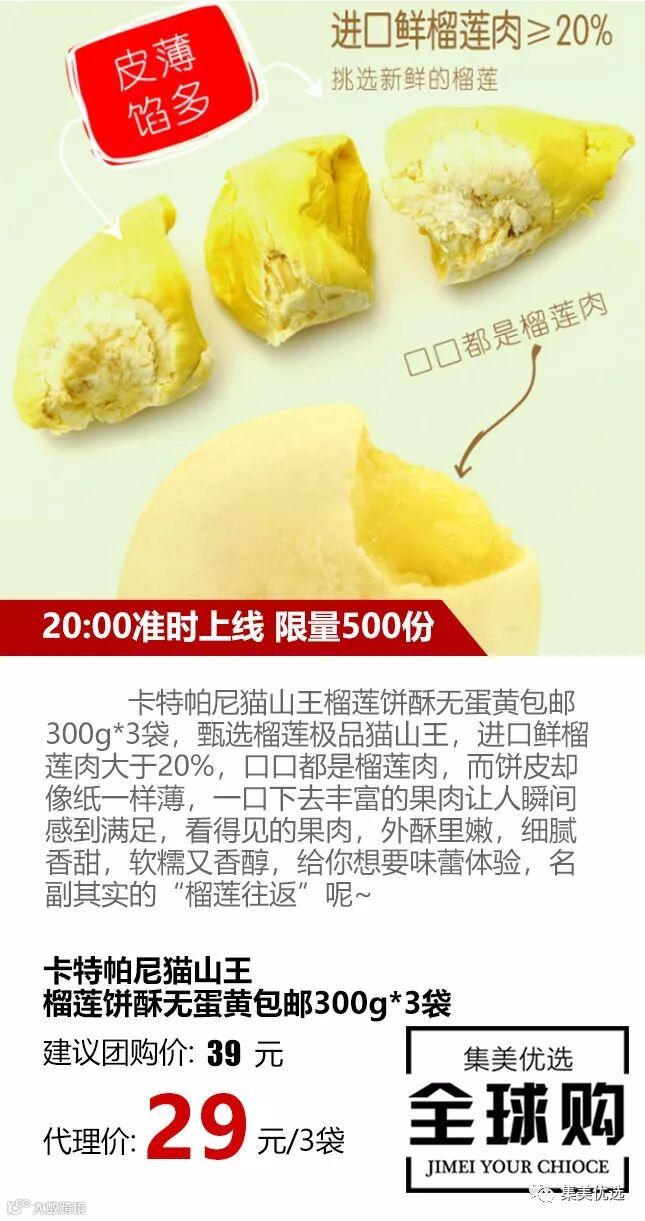 卡特帕尼猫山王榴莲饼酥无蛋黄包邮300g*3袋,甄选榴莲极品猫山王,进口鲜榴莲肉大于20%,口口都是榴莲肉,而饼皮却像纸一样薄,一口下去丰富的果肉让人瞬间感到满足,看得见的果肉,外酥里嫩,细腻香甜,软糯又香醇,给你想要味蕾体验,名副其实的“榴莲往返”呢~