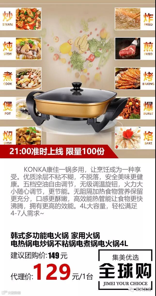 KONKA康佳一锅多用,让烹饪成为一种享受。优质涂层不粘不糊,不脱落,安全美味更健康。五档空油自由调节,无级调温旋钮,火力大小随心调节,更节能。无阻隔加热食物营养保留更充分,口感更酥嫩,高效能热管能让食物更快沸腾,拥有更高的效能。4L大容量,轻松满足4-7人需求~