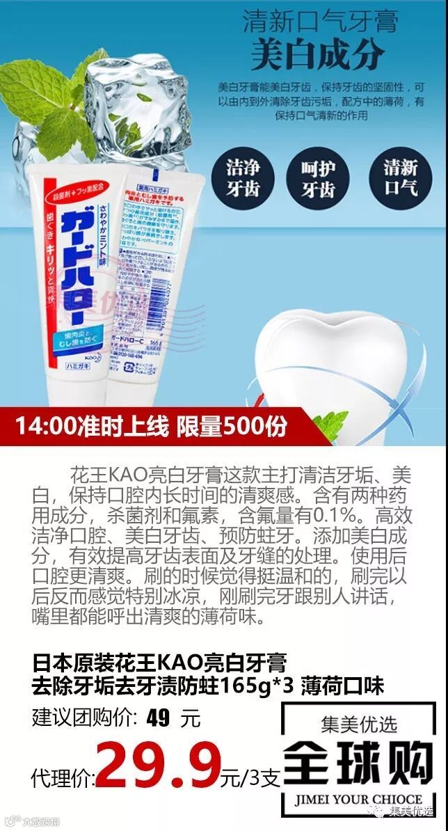 花王KAO亮白牙膏这款主打清洁牙垢、美白,保持口腔内长时间的清爽感。含有两种药用成分,杀菌剂和氟素,含氟量有0.1%。高效洁净口腔、美白牙齿、预防蛀牙。添加美白成分,有效提高牙齿表面及牙缝的处理。使用后口腔更清爽。刷的时候觉得挺温和的,刷完以后反而感觉特别冰凉,刚刷完牙跟别人讲话,嘴里都能呼出清爽的薄荷味~