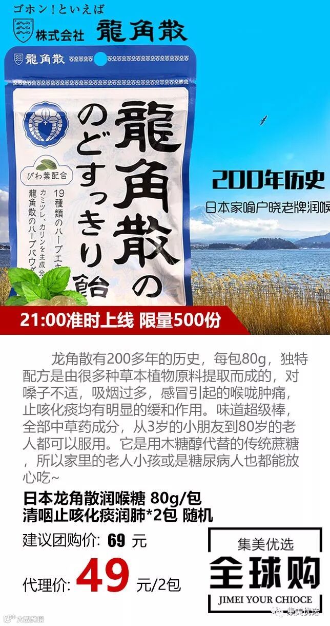 龙角散有200多年的历史,每包80g,独特配方是由多种草本植物原料提取而成的,对嗓子不适,吸烟过多,感冒引起的喉咙肿痛,止咳化痰均有明显的缓和作用。味道超级棒,全部中草药成分,从3岁的小朋友到80岁的老人都可以服用。它是用木糖醇代替的传统蔗糖,所以家里的老人小孩或是糖尿病人也都能放心吃~
