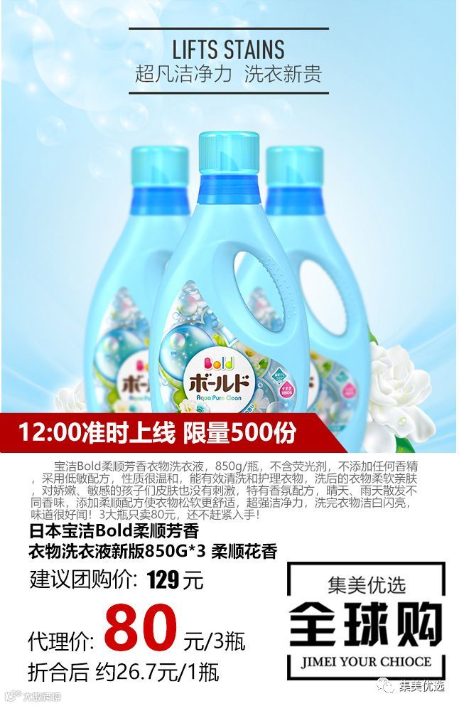 宝洁Bold柔顺芳香衣物洗衣液,850g/瓶,不含荧光剂,不添加任何香精,采用低敏配方,性质很温和,能有效清洗和护理衣物,洗后的衣物柔软亲肤,对娇嫩、敏感的孩子们皮肤也没有刺激,特有香氛配方,晴天、雨天散发不同香味,添加柔顺配方使衣物松软更舒适,超强洁净力,洗完衣物洁白闪亮,味道很好闻!3大瓶只卖80元,还不赶紧入手!