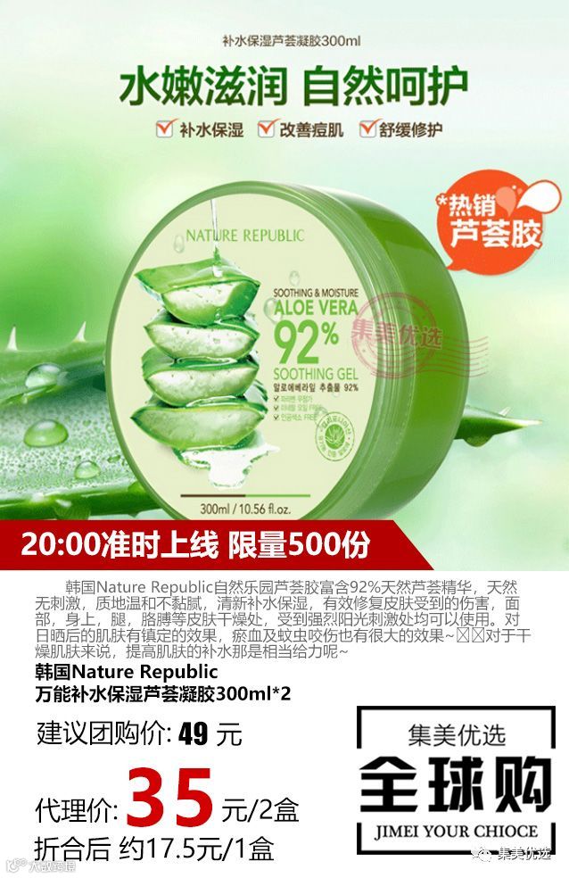 🌺韩国Nature Republic自然乐园芦荟胶富含92%天然芦荟精华,天然无刺激,质地温和不黏腻,清新补水保湿,有效修复皮肤受到的伤害,面部,身上,腿,胳膊等皮肤干燥处,受到强烈阳光刺激处均可以使用。👉🏻对日晒后的肌肤有镇定的效果,瘀血及蚊虫咬伤也有很大的效果~👉🏻对于干燥肌肤来说,提高肌肤的补水那是相当给力呢~