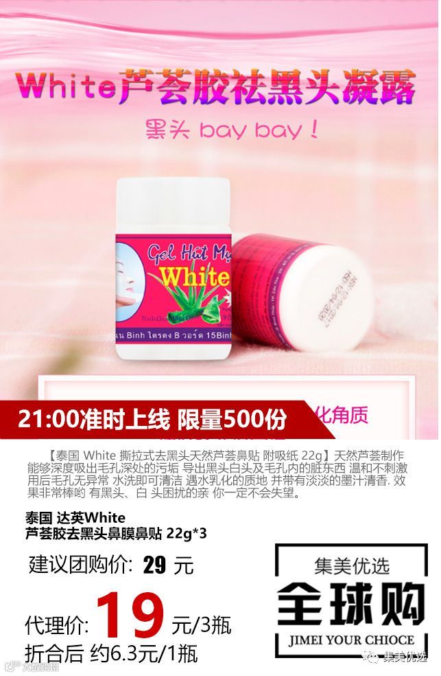 【泰国 White 撕拉式去黑头天然芦荟鼻贴 附吸纸 22g】😉天然芦荟制作👄 能够深度吸出毛孔深处的污垢😍 导出黑头白头及毛孔内的脏东西😘 温和不刺激💪 用后毛孔无异常🎄 水洗即可清洁💦 遇水乳化的质地🌹 并带有淡淡的墨汁清香.☀ 效果非常棒哟☔ 有黑头、白 头困扰的亲👍 你一定不会失望。