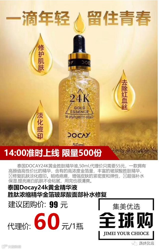 泰国🇹🇭DOCAY24K黄金胜肽精华液,50ml,代理价只需要55元,一款拥有高颜值高性价比的精华,含有的高浓度金箔量🔆,丰富的玻尿酸胜肽精华,🌱修复肌肤淡化痘印。暗疮疤痕,增强皮肤的紧密度和弹性,💧超强补水保湿.提亮嫩白肌肤不会粘腻,用完也很清爽。孕妇可用哦,🌈