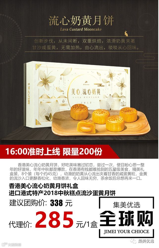 香港美心流心奶黄月饼👉,好吃美味赛过初恋,尝过一次,便目盼心思一整年的好滋味,年年中秋都是爆款,在香港有钱都难抢到的五星级美食,精美礼盒装,8个装(每个约45克),幼滑的奶黄从心流出夹着甘香的咸蛋黃粒,金黃的流沙入口更酥香松化,幼滑香浓,令人回味无穷,茶余饭后总想再来一口。