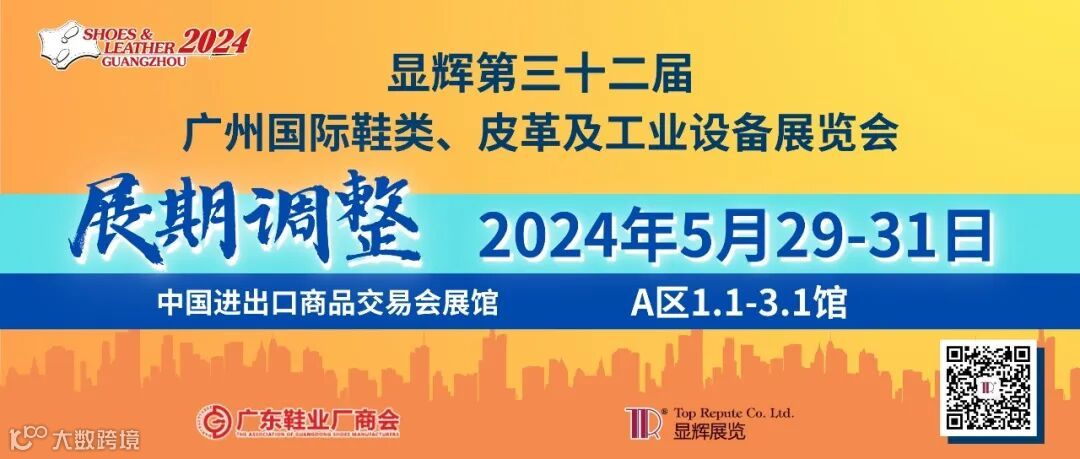 经主办方慎重考虑,为保证参展效果及参展商利益,原定于2024年6月3-5日举办的「第三十二届广州国际鞋类、皮革及工业设备展览会」,调整为2024年5月29-31日在广交会展馆A区举办。