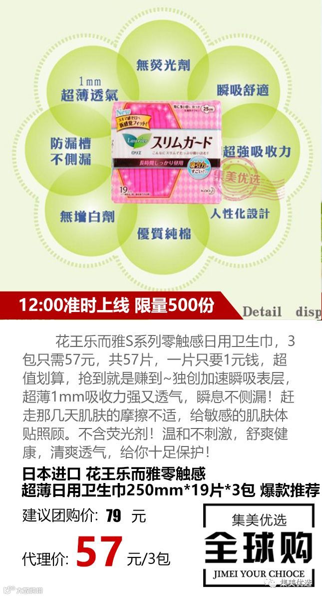 花王乐而雅S系列零触感日用卫生巾,3包只需57元,共57片,一片只要1元钱,超值划算,抢到就是赚到~独创加速瞬吸表层,超薄1mm吸收力强又透气,瞬息不侧漏!赶走那几天肌肤的摩擦不适,给敏感的肌肤体贴照顾。不含荧光剂!温和不刺激,舒爽健康,清爽透气,给你十足保护!