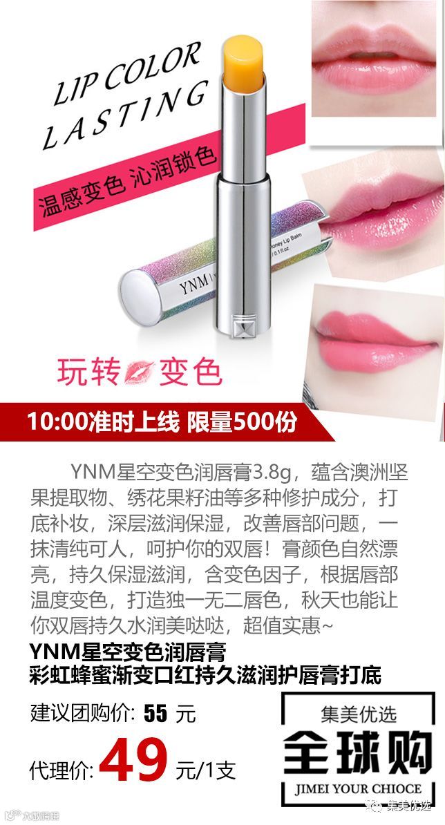 YNM星空变色润唇膏3.8g,蕴含澳洲坚果提取物、绣花果籽油等多种修护成分,打底补妆,深层滋润保湿,改善唇部问题,一抹清纯可人,呵护你的双唇!膏颜色自然漂亮,持久保湿滋润,含变色因子,根据唇部温度变色,打造独一无二唇色,秋天也能让你双唇持久水润美哒哒,超值实惠~