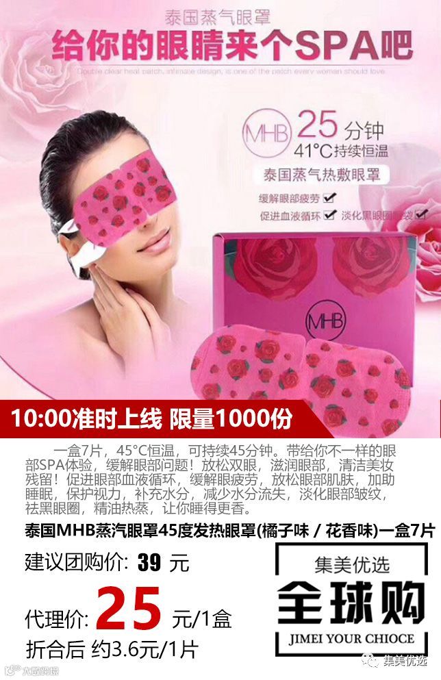 一盒7片,45°C恒温,可持续45分钟。带给你不一样的眼部SPA体验,缓解眼部问题!放松双眼,滋润眼部,清洁美妆残留!促进眼部血液循环,缓解眼疲劳,放松眼部肌肤,加助睡眠,保护视力,补充水分,减少水分流失,淡化眼部皱纹,祛黑眼圈,精油热蒸,让你睡得更香。