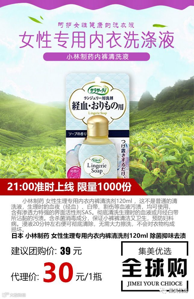 小林制药 女性生理专用内衣内裤清洗剂120ml ,这不是普通的清洗液,生理时的血夜(经血)、白带、割伤等血液污渍,均可使用,含有渗透力特强的界面活性剂SAS。彻底清洗生理时的血液或月经白带所沾黏的污渍。含杀菌消毒成分,保证小裤裤清洁又卫生,预防妇科病。浸液20分钟左右便可彻底清除,无需大力擦洗,不会对衣物构成损坏。