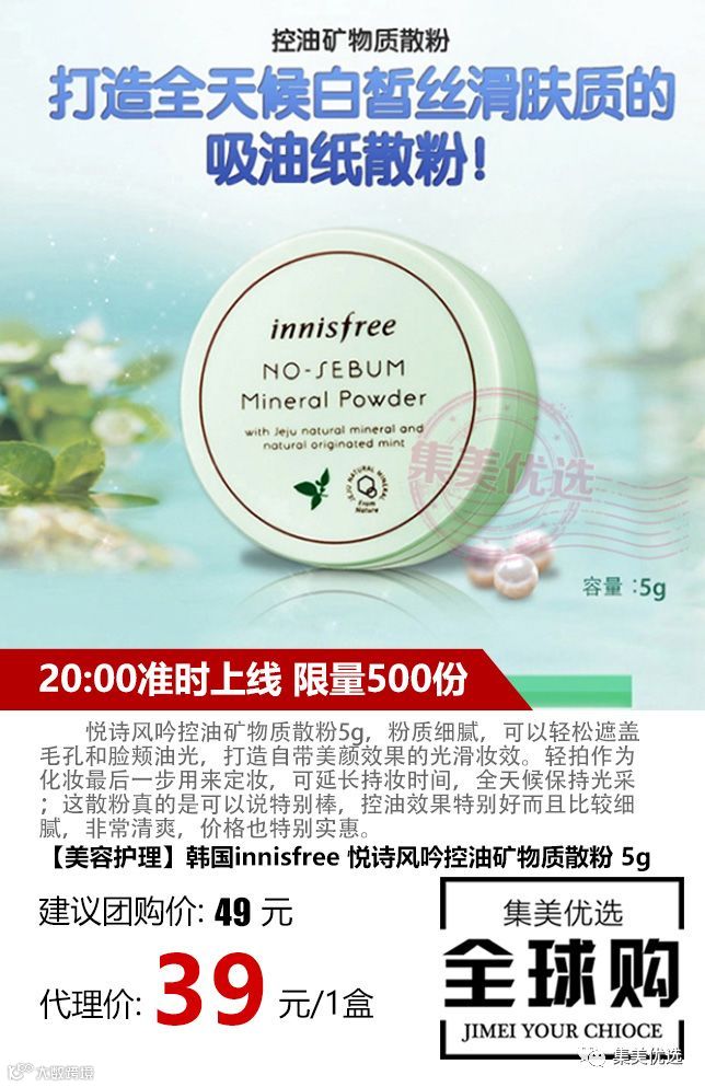 悦诗风吟控油矿物质散粉5g,粉质细腻,可以轻松遮盖毛孔和脸颊油光,打造自带美颜效果的光滑妆效。轻拍作为化妆最后一步用来定妆,可延长持妆时间,全天候保持光采;这散粉真的是可以说特别棒,控油效果特别好而且比较细腻,非常清爽,价格也特别实惠。