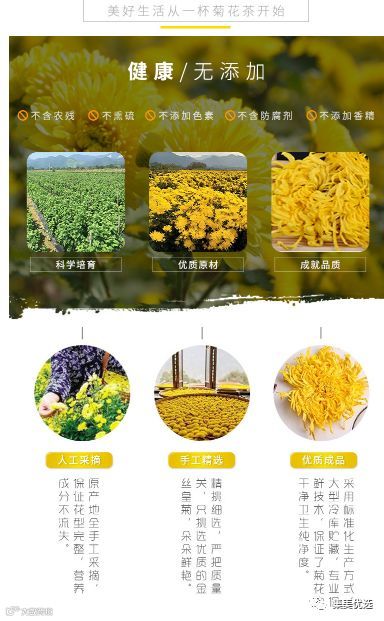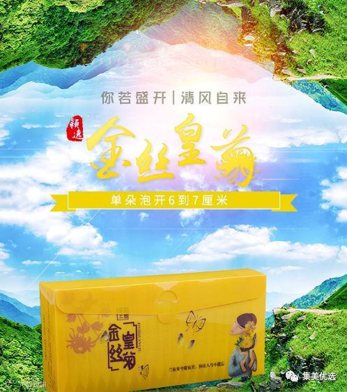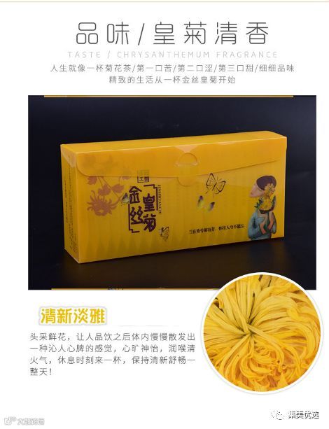 金丝皇菊的黄酮素含量极高,富含多种氨基酸、维生素和微量元素。具有"香、甜、润"三大特点,还有散风热、明目功效。现在品菊、赏菊也已经成为很多人的休闲生活之一。用皇菊泡茶,气味芳香,可消暑生津,祛风,润喉,养目,解酒。包装礼盒装送亲朋好友都非常高大上,花很大一朵,冲泡起来充满整个杯子颜值很高!!!!