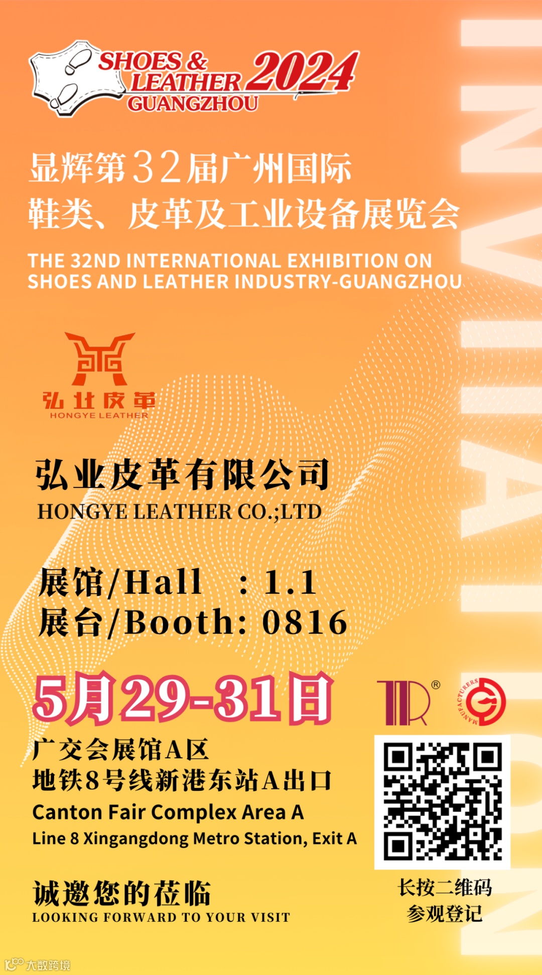第32届显辉广州国际鞋类、皮革及工业设备展暨首届广州国际鞋类制成品展览会将于5月29-31日,在广交会A区1.1-3.1馆举行。我会理事单位辛集市弘业皮革有限公司参展,欢迎广大客商、新老客户莅临展位指导交流!