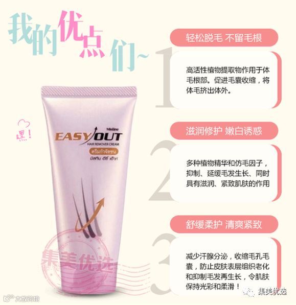 这是支脸部都可以用的脱毛膏‼️ 身体也可以用,含有高活性植物提取物作用于体毛根部 促进毛囊收缩 讲体毛挤出体外 ;多种植物精华和仿毛因子 抑制 延缓毛发生长 同时具有滋润紧致肌肤作用,泰国本土产品🇹🇭它的区别就在于它的成分非常温和 根本不刺激皮肤全到脸部和私处都搞的定,而且还有一个重要的是 很多脱毛产品你当时用了 毛是脱了 恐怖的是第二天第三天就像胡渣一样疙疙瘩瘩立起来了,这款脱毛膏脱毛,毛毛都变的特别软,一刮就掉,不会变粗。