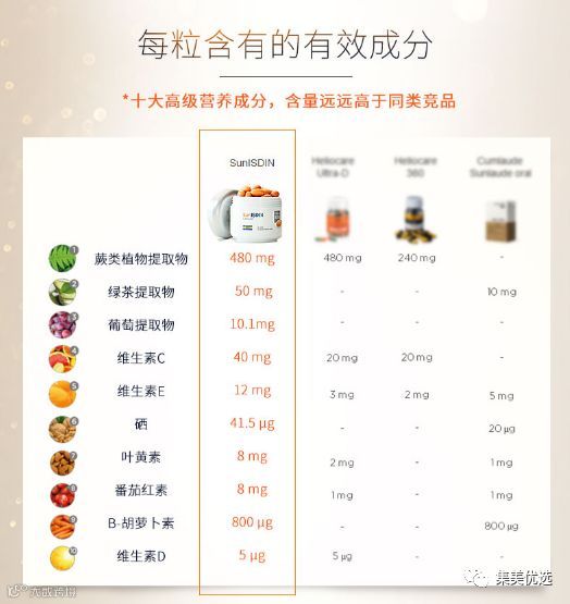 由高级天然果蔬和植物萃取,含有植物性防晒配方Fernblock,可以抗氧化和防紫外线,预防日照引起的衰老,从细胞内部提升皮肤防晒力,使肌肤不易晒伤,保护眼周肌肤,防止眼部黄斑,吃完半小时后起效,适合紫外线特别敏感人群或者是外出度假使用。建议搭配外部防晒使用效果更佳。