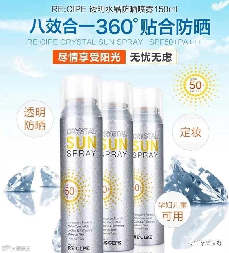 韩国RE:CIPE莱斯璧水晶防晒喷雾,八效合一,360°贴合防晒。防晒、全透明、防水、定妆、保湿、清爽、SPF50+PA+++,防晒时间长达12小时,非常清爽,完全不留白,彻底防御紫外线,不受汗水和皮脂的影响,超强防水功能,夏日海边出游必备神器,皮肤潮湿的情况下也可以直接使用。没有油腻或黏着感,化妆后使用不仅可以阻挡紫外线,还能起到定妆效果。透明的颜色不用担心脱妆,敏感肌肤甚至孕妇都可用!