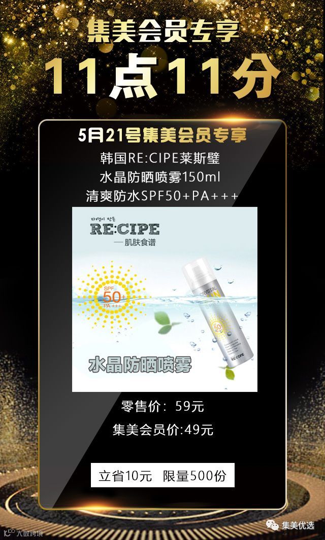5月21日,11:11,韩国RE:CIPE莱斯璧 水晶防晒喷雾150ml 清爽防水SPF50+PA+++,原价59元,建议零售价49元,限量500份,手慢无!!!