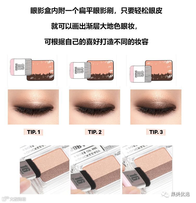 爆了 韩国刷爆ins的16brand懒人眼影,双色眼影!拯救手残党必备神器懒人专用!只需3秒就能画完!能多睡半小时绝不早起,一分钟可爱的外形很有新意,日常的配色加上非常方便的上妆方式,能快速完成日常眼妆。重要的是:价格也很实惠! 经典大地色系,刷子的设计也很有新意,可以十分快速的完成眼妆,适合懒人使用,刷毛细腻柔软,能很好的晕染眼影。用刷子直接取两色眼影,刷上眼后,只要稍微晕染一下边界,带过眼下,然后画上眼线和睫毛膏就能简单完成一个日常眼妆。