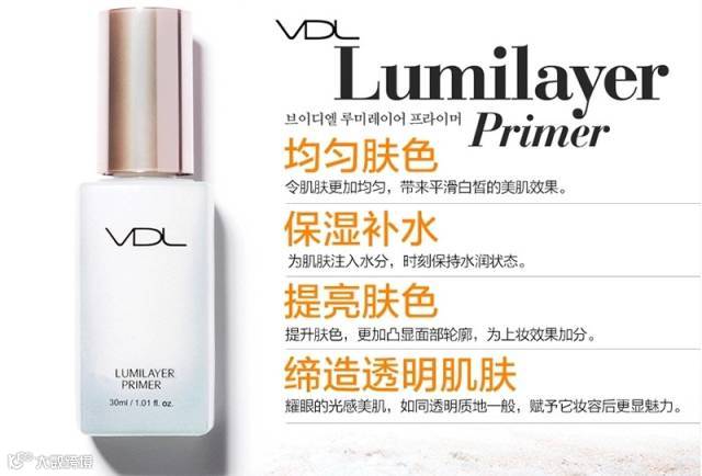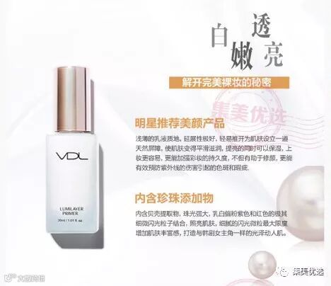 VDL贝壳提亮液妆前乳,内含贝壳提取液,乳白偏粉紫色和红色的极其细微闪光粒子结合,照亮肌肤,调节肌肤气色,蓝色的细微闪光粒打造透明通透的皮肤。细腻的闪光微粒最大限度增加肌肤丰富感和打造3D立体妆容。
