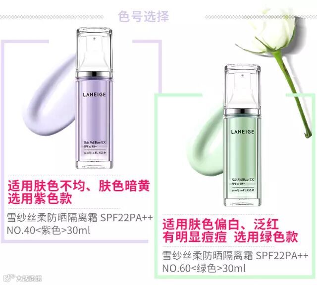 绿色60#:适合脸颊泛红,红血丝多的肌肤,可以用绿色隔离修饰泛红。