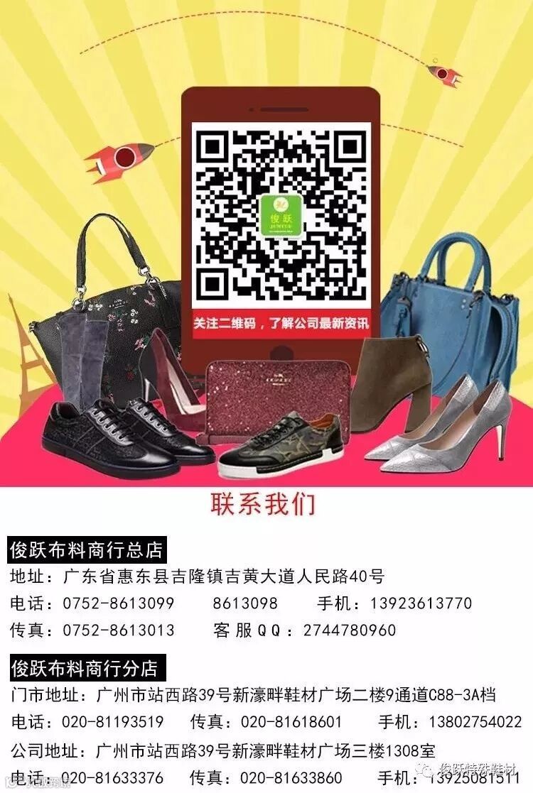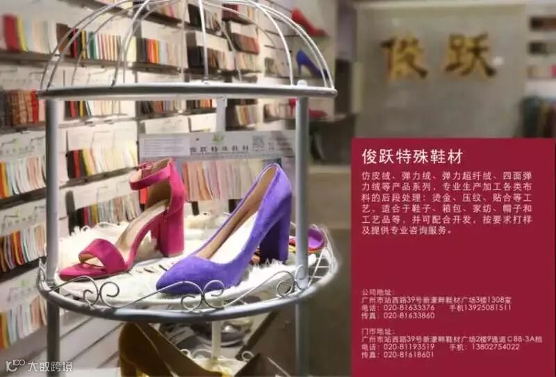 俊跃特殊鞋材,创办于2014年,总部位于惠东吉隆,分部位于广州新濠畔。俊跃以“为顾客创造价值、为自己提升品质”的经营理念,打造布料销售品牌企业,旗下产品已超过3000种,如:绒布系列、烫金加工系列、水溶网料系列、蕾丝系列等……,面料可用于鞋子、沙发、箱包、服装、窗帘布等各领域的搭配和制作。凭借优质的产品,合理的价格,满意的销售服务,俊跃深得广大客户的支持与信赖。成功引领行业风向,赢得国内外市场的认可。在未来发展计划,俊跃依然提供全方位、多元化、宽层次服务放在第一位——我们竭诚期待能与各界同仁合作共赢,再创辉煌!