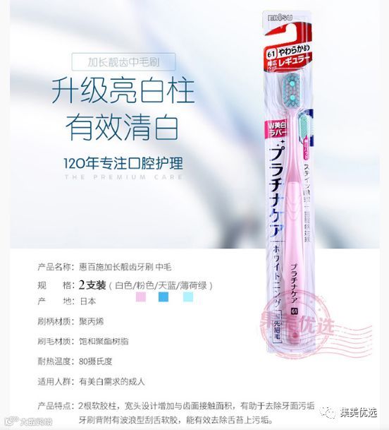 EBiSU惠百施是日本家喻户晓的牙刷品牌,日本家庭都会选择EBiSU的牙刷,是日本三大牙刷品牌之一,也是目前日本主要牙刷品牌中历史最悠久的。拥有120多年历史的日本口腔护理品牌, 经过针对几十个国家刷牙习惯于口腔的调查,研究设计出了一款,用起来超级舒服,好用到爆的——EBiSU 超软毛宽头牙刷,更是获得过 GOOD DESIGN 等设计大奖。。。
